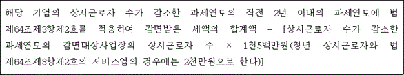 ① 법 제64조제1항제1호에서 "대통령령으로 정하는 농공단지"란 수도권 과밀억제권역외의 지역으로서 농공단지지정일 현재 인구 20만 미만인 시(특별자치시와 「제주특별자치도의 설치 및 국제자유도시 조성을 위한 특별법」 제10조제2항에 따른 행정시를 포함한다. 이하 제2항에서 같다) · 군 · 구(자치구인 구를 말한다. 이하 제2항에서 같다)에 소재하는 농공단지를 말한다. <개정 2000.12.29, 2002.12.30, 2010.2.18, 2023.2.28> ② 법 제64조제1항제2호에서 "대통령령으로 정하는 지역"이란 수도권과밀억제권역 외의 지역으로서 중소기업특별지원지역의 지정일 현재 인구 20만 미만인 시 · 군 · 구에 소재하는 중소기업특별지원지역으로서 기획재정부령으로 정하는 지역을 말한다. <개정 2000.12.29, 2002.12.30, 2008.2.29, 2010.2.18, 2015.2.3, 2022.1.25, 2023.2.28> ③ 법 제64조제3항제1호에서 "대통령령으로 정하는 투자누계액"이란 법 제64조제2항에 따라 소득세 또는 법인세를 감면받는 해당 과세연도까지의 기획재정부령으로 정하는 사업용자산에 대한 투자 합계액을 말한다. <신설 2019.2.12> ④ 법 제64조제3항제2호에서 "대통령령으로 정하는 서비스업"이란 제23조제4항에 따른 서비스업을 말한다. <신설 2019.2.12> ⑤ 법 제64조제5항에 따라 납부해야 할 소득세액 또는 법인세액은 다음의 계산식에 따라 계산한 금액(그 수가 음수이면 영으로 보고, 감면받은 과세연도 종료일 이후 2개 과세연도 연속으로 상시근로자 수가 감소한 경우에는 두 번째 과세연도에는 첫 번째 과세연도에 납부한 금액을 뺀 금액을 말한다)으로 하며, 이를 상시근로자 수가 감소한 과세연도의 과세표준을 신고할 때 소득세 또는 법인세로 납부해야 한다. <신설 2019.2.12, 2023.2.28> ⑥ 법 제64조제3항 및 제5항을 적용할 때 상시근로자 및 청년 상시근로자의 범위, 상시근로자 수 및 청년 상시근로자 수의 계산방법에 관하여는 제11조의2제6항 및 제7항을 준용한다. <신설 2019.2.12, 2023.2.28> ⑦ 법 제64조제7항에서 "대통령령으로 정하는 바에 따라 계산한 세액"이란 다음 각 호의 구분에 따른 세액을 말한다. <신설 2022.2.15> 1. 법 제64조제7항제1호에 해당하는 경우: 폐업일 또는 법인 해산일부터 소급하여 3년 이내에 감면된 세액 2. 법 제64조제7항제2호에 해당하는 경우: 이전일부터 소급하여 5년 이내에 감면된 세액 ⑧ 법 제64조제1항의 규정을 적용받고자 하는 자는 과세표준신고와 함께 기획재정부령이 정하는 세액감면신청서를 납세지 관할세무서장에게 제출하여야 한다. <개정 2008.2.29, 2019.2.12, 2022.2.15>