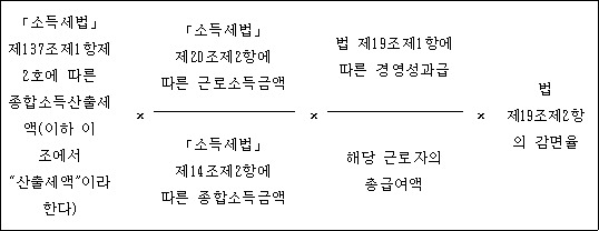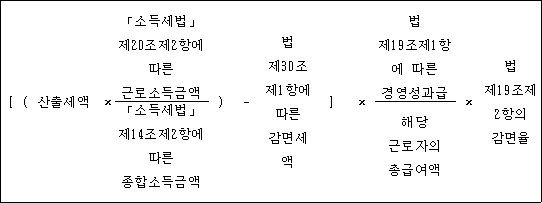 ① 법 제19조제1항 본문에서 "대통령령으로 정하는 상시근로자"란 「근로기준법」에 따라 근로계약을 체결한 내국인 근로자를 말한다. 다만, 다음 각 호의 어느 하나에 해당하는 사람은 제외한다. <개정 2020.2.11, 2020.6.2> 1. 근로계약기간이 1년 미만인 근로자(근로계약의 연속된 갱신으로 인하여 그 근로계약의 총 기간이 1년 이상인 근로자는 제외한다) 2. 「근로기준법」 제2조제1항제9호에 따른 단시간근로자. 다만, 1개월간의 소정근로시간이 60시간 이상인 근로자는 상시근로자로 본다. 3. 「법인세법 시행령」 제40조제1항 각 호의 어느 하나에 해당하는 임원 4. 해당 기업의 최대주주 또는 최대출자자(개인사업자의 경우에는 대표자를 말한다)와 그 배우자 5. 제4호에 해당하는 자의 직계존비속(그 배우자를 포함한다) 및 「국세기본법 시행령」 제1조의2제1항에 따른 친족관계인 사람 6. 「소득세법 시행령」 제196조에 따른 근로소득원천징수부에 의하여 근로소득세를 원천징수한 사실이 확인되지 않고, 다음 각 목의 어느 하나에 해당하는 금액의 납부사실도 확인되지 않은 자 가. 「국민연금법」 제3조제1항제11호 및 제12호에 따른 부담금 및 기여금 나. 「국민건강보험법」 제69조에 따른 직장가입자의 보험료 7. 해당 과세기간의 총급여액이 7천만원을 초과하는 근로자 ② 법 제19조제1항 본문에서 "대통령령으로 정하는 경영성과급"이란 「중소기업 인력지원 특별법 시행령」 제26조의2제1항제1호에 따른 성과급을 말한다. <개정 2022.2.15> 1. 삭제 <2022.2.15> 2. 삭제 <2022.2.15> ③ 법 제19조제1항을 적용할 때 상시근로자의 수는 다음의 계산식에 따라 계산한 수(100분의 1 미만의 부분은 없는 것으로 한다)로 한다. ④ 제3항에 따른 상시근로자 수의 계산에 관하여는 제23조제11항 각 호 외의 부분 후단 및 같은 항 제2호를 준용한다. ⑤ 법 제19조제1항에 따라 세액공제를 받으려는 자는 과세표준신고와 함께 기획재정부령으로 정하는 세액공제신청서 및 공제세액계산서를 납세지 관할 세무서장에게 제출해야 한다. ⑥ 법 제19조제2항제2호에서 "해당 기업의 최대주주 등 대통령령으로 정하는 사람"이란 다음 각 호의 어느 하나에 해당하는 사람을 말한다. 1. 해당 기업의 최대주주 또는 최대출자자(개인사업자의 경우에는 대표자를 말한다)와 그 배우자 2. 제1호에 해당하는 자의 직계존비속(그 배우자를 포함한다) 또는 제1호에 해당하는 사람과 「국세기본법 시행령」 제1조의2제1항에 따른 친족관계에 있는 사람 ⑦ 법 제19조제2항에 따른 감면세액은 다음 계산식에 따라 계산한 금액으로 한다. ⑧ 제7항에도 불구하고 법 제19조제2항에 따라 세액감면을 받으려는 자가 법 제30조제1항에 따라 감면을 받는 경우 법 제19조제2항에 따른 감면세액은 다음 계산식에 따라 계산한 금액으로 한다. ⑨ 법 제19조제2항에 따라 세액감면을 받으려는 자는 경영성과급을 지급받은 날이 속하는 달의 다음 달 말일까지 기획재정부령으로 정하는 세액감면신청서를 원천징수의무자에게 제출해야 한다. ⑩ 제9항에 따라 세액감면신청서를 제출받은 원천징수의무자는 기획재정부령으로 정하는 감면 대상 명세서를 신청을 받은 날이 속하는 달의 다음 달 말일까지 원천징수 관할 세무서장에게 제출해야 한다. [본조신설 2019.2.12]