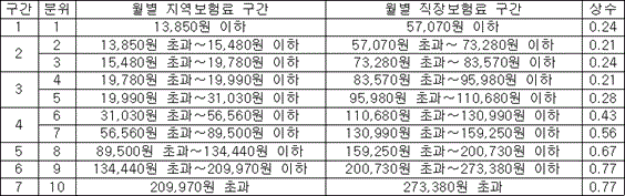 2. 해당 연도 최종 부과월 1일에 직장가입자인 경우에는 해당 연도 중에 부담한 월별 지역보험료를 다음의 표에 따른 상수로 나누어 얻은 각각의 금액 총액과 해당 연도 중에 부담한 직장보험료 총액(보수월액보험료와 소득월액 보험료를 더한 금액)을 합한 금액을 그 부과월수로 나눈 금액