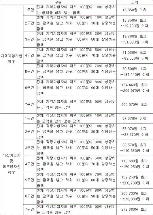 ① 「국민건강보험법 시행령」(이하 "영"이라 한다) 별표 3제1호 전단에 따른 가입자 또는 피부양자의 개인별 보험료 부담수준(이하 "상한액기준보험료"라 한다)은 「국민건강보험법」(이하 "법"이라 한다) 제69조에 따른 보험료(법 제75조에 따른 경감이 있는 경우에는 경감 후의 금액을 말한다. 이하 같다)를 기준으로 다음 각 호의 구분에 따라 산정한 금액을 말한다. 1. 지역가입자인 경우에는 그 지역가입자가 속한 세대가 연간 부담한 월별 지역보험료의 총액을 그 부과월수로 나눈 금액