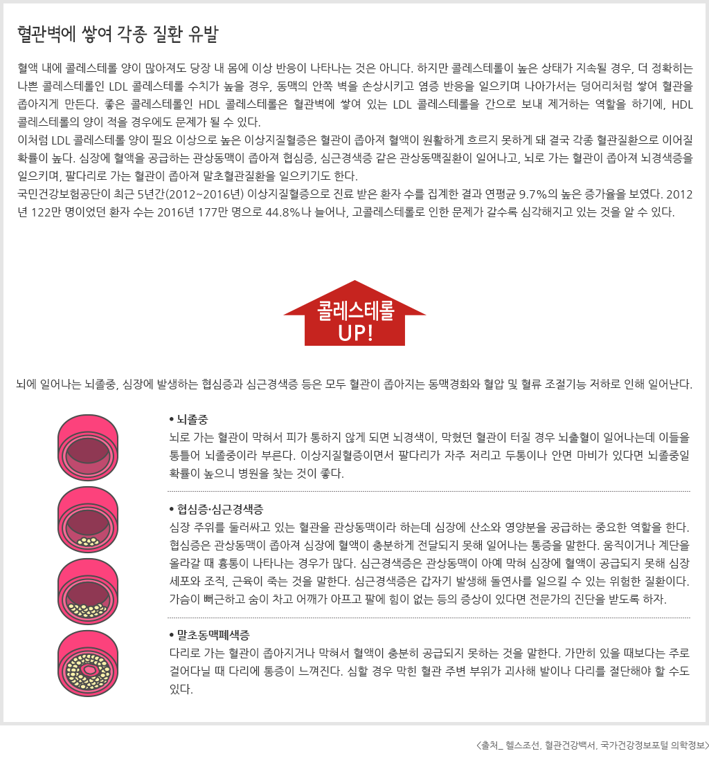 혈액 내에 콜레스테롤 양이 많아져도 당장 내 몸에 이상 반응이 나타나는 것은 아니다. 하지만 콜레스테롤이 높은 상태가 지속될 경우, 더 정확히는 나쁜 콜레스테롤인 LDL 콜레스테롤 수치가 높을 경우, 동맥의 안쪽 벽을 손상시키고 염증 반응을 일으키며 나아가서는 덩어리처럼 쌓여 혈관을 좁아지게 만든다. 좋은 콜레스테롤인 HDL 콜레스테롤은 혈관벽에 쌓여 있는 LDL 콜레스테롤을 간으로 보내 제거하는 역할을 하기에, HDL 콜레스테롤의 양이 적을 경우에도 문제가 될 수 있다.이처럼 LDL 콜레스테롤 양이 필요 이상으로 높은 이상지질혈증은 혈관이 좁아져 혈액이 원활하게 흐르지 못하게 돼 결국 각종 혈관질환으로 이어질 확률이 높다. 심장에 혈액을 공급하는 관상동맥이 좁아져 협심증, 심근경색증 같은 관상동맥질환이 일어나고, 뇌로 가는 혈관이 좁아져 뇌경색증을 일으키며, 팔다리로 가는 혈관이 좁아져 말초혈관질환을 일으키기도 한다.