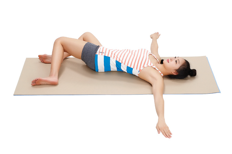 1. 누워서 양손은 열십자로 벌리고 양 무릎은 골반 너비로 벌려 세운다.