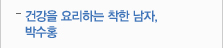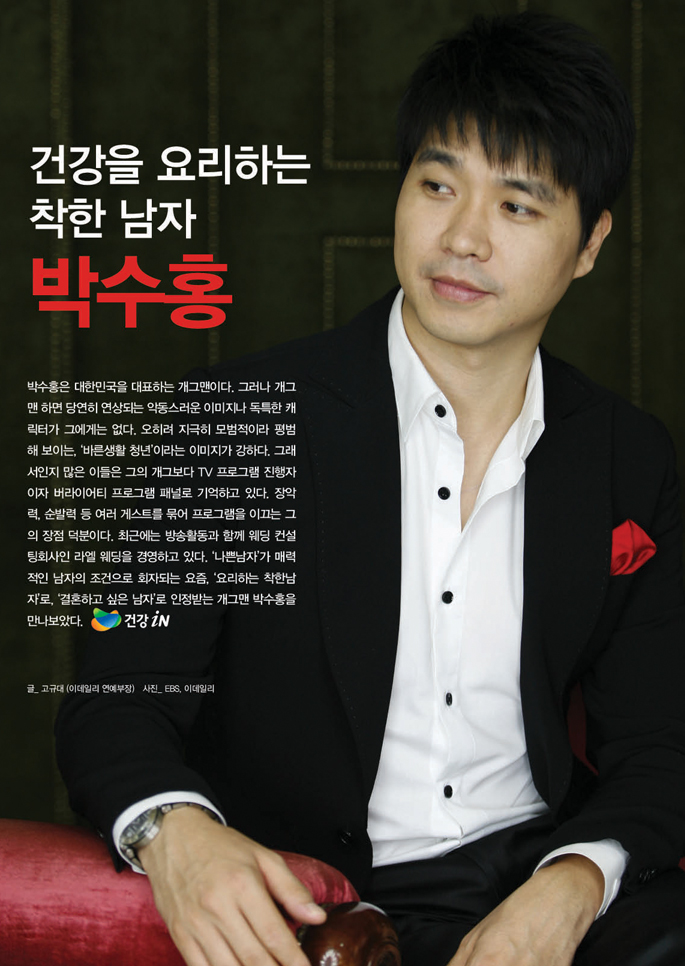 건강을 요리하는 착한 남자, 박수홍_박수홍은 대한민국의 대표 개그맨이다. 1991년 KBS  <대학 개그 콘테스트> 동상을 수상하면서 연예계에 데뷔했다. 많은 이들은 그의 개그보다 TV 프로그램 진행자이자 버라이어티 프로그램 패널로 기억하고 있다. 장악력, 순발력 등 그의 장점 덕분이다. 최근에는 방송활동과 함께 웨딩 컨설팅회사인 라엘 웨딩을 경영하고 있다.