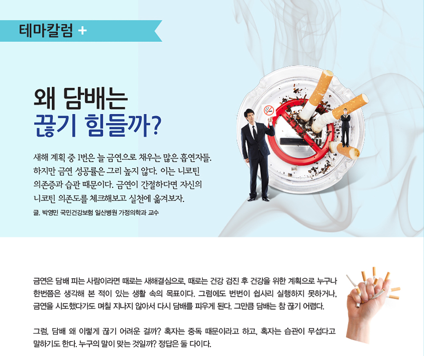 테마칼럼-왜 담배는 끊기 힘들까? 마약제재보다 더 강력한 니코틴 의존 편안함과 보상이 주는 습관 나의 니코틴 중독도는 어느 정도일까? 박영민 국민건강보험 일산병원 가정의학과 교수
