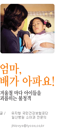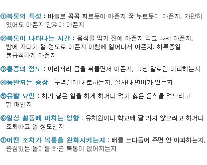 ÀÌ ¼¼ °¡Áö°¡ ¾ÆÀ̵éÀÌ ºÎ¸ð´Ôµé¿¡°Ô ¾ÆÇÄÀ» È£¼ÒÇÒ ¶§ ¸»ÇÏ´Â °¡Àå ÈçÇÑ Ç¥ÇöÀÏ °ÍÀÔ´Ï´Ù. ÀÌ Áß¿¡¼µµ ¹è°¡ ¾ÆÇ º¹ÅëÀ» È£¼ÒÇÏ´Â °æ¿ì°¡ °¡Àå ÈçÇѵ¥ Çе¿±â ¾Æµ¿ÀÇ 10%¿¡¼ ¹ß»ýÇÏ´Â Áõ»óÀÔ´Ï´Ù. ÀÇÇÐÀû ¿ë¾î·Î º¼ ¶§ 4¼¼¿¡¼ 16¼¼ »çÀÌÀÇ ¼Ò¾Æ¿¡¼ 3°³¿ù¿¡ 3ȸÀÌ»ó ¹Ýº¹ÀûÀ¸·Î ¹ß»ýµÇ¾î ÀÏ»ó»ýȰ(Çб³»ýȰ Æ÷ÇÔ)¿¡ ÁöÀåÀ» ÃÊ·¡ÇÏ´Â º¹ÅëÀ» ¸¸¼º ¹Ýº¹¼º º¹ÅëÀ̶ó°í ÇÕ´Ï´Ù. ÇÏÁö¸¸ ´Ã ¹è°¡ ¾ÆÇÁ´Ù´Â ¸»À» ´Þ°í »ç´Â, ±×·¯³ª ±×¸® ½ÉÇØ º¸ÀÌÁö ¾Ê°í ´Ù¸¥ µ¥ °ü½ÉÀ» µ¹¸®¸é º¹ÅëÀ» È£¼ÒÇÏÁö ¾Ê´Â ¾ÆÀ̵鵵 ÀÌ ¹üÁÖ¿¡ Æ÷ÇÔ½Ãų ¼ö ÀÖ½À´Ï´Ù.