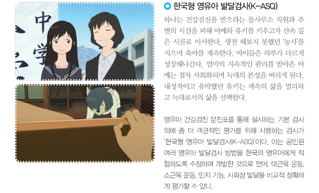 영유아 건강검진 문진표를 통해 실시하는 기본 검사 외에 좀 더 객관적인 평가를 위해 시행하는 검사가 ‘한국형 영유아 발달검사(K-ASQ)’이다. 이는 공인된 여러 영유아 발달검사 방법을 한국의 영유아에게 적합하도록 수정하여 개발한 것으로 언어, 대근육 운동, 소근육 운동, 인지 기능, 사회성 발달을 비교적 정확하게 평가할 수 있다.