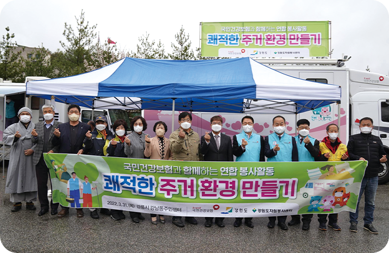 공단은 저소득 주거취약계층 등 사회적 약자 보호를 위해 건강보험과 함께하는 ‘쾌적한 주거환경 만들기’ 강원지역 연합 봉사활동을 확대한다. 공단의 건이강이 봉사단과 강원지역 지자체 등 지역사회 구성원들과 함께 추진하는 사회공헌사업인 쾌적한 주거환경 만들기는 저소득 주거취약계층 발굴과 사회적 약자 보호를 위한 연합 봉사활동 프로그램을 각 지역 봉사단체에서 주관·진행할 예정이다.