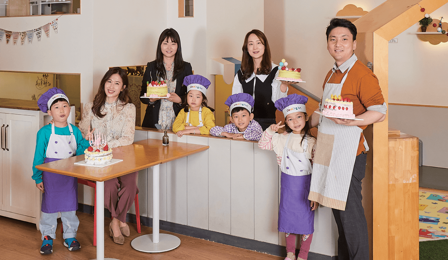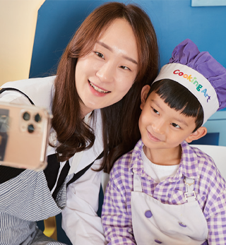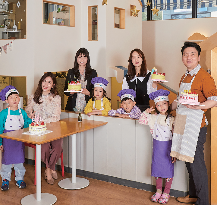 쿠킹 스튜디오에 준비된 앞치마와 모자를 쓰니 제법 꼬마 파티시에 느낌이 난다. 보호자들도 앞치마를 착용하고, 요리 시작 전 기본인 손 씻기를 마치고 본격적으로 케이크 만들기에 들어갔다.