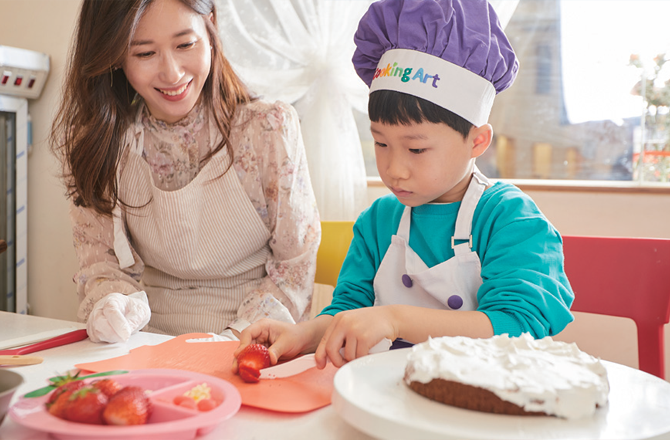 수업은 강사의 설명과 시범을 보고 따라 하는 방식으로 진행됐다. 아이들 모두 처음 해보는 일이고 낯선 도구들이 가득해서인지 집중하는 모습을 보였다. 고사리손으로 서툴지만 하나씩 따라 하는 모습을 보는 엄마 아빠의 눈에는 대견함이 가득하다. 케이크를 만들 때 가장 중요한 것은 시트지에 휘핑크림을 고르게 덮는 과정이다. 그래야 다음 시트를 올려도 케이크의 모양이 잘 유지된다. 아이들은 딸기도 직접 잘라 올리고, 스패츌러로 휘핑크림 바르기에 도전했다. 조금 어려운 부분은 엄마 아빠의 도움을 받으며 하나하나 완성해갔다.