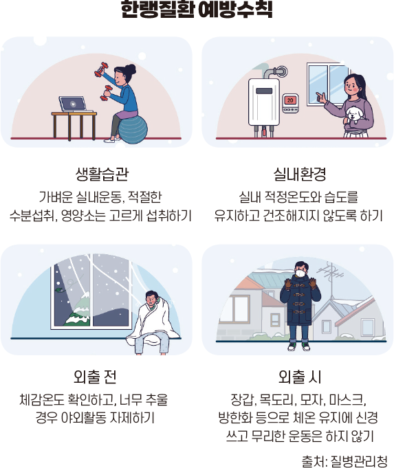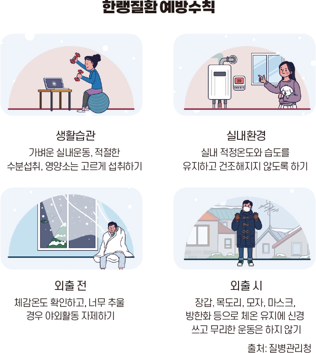갑작스러운 기온 변화에 대처하지 못해 생기는 한랭질환은 저체온증과 동상이 대표적이다. 저체온증은 영양 공급이나 보온이 충분하지 않은 노인, 노숙인이나 등산객 등 장시간 야외에서 추위에 노출된 사람, 알코올이나 약물 중독 등 술이나 약물을 과용한 사람, 추운 환경에 노출된 영유아 등이 위험군이다. 혈액순환 장애가 있거나 장갑, 신발, 양말 등 체온을 유지할 수 있는 의복을 적절하게 갖추지 못한 경우 동상에 걸릴 위험이 높다.